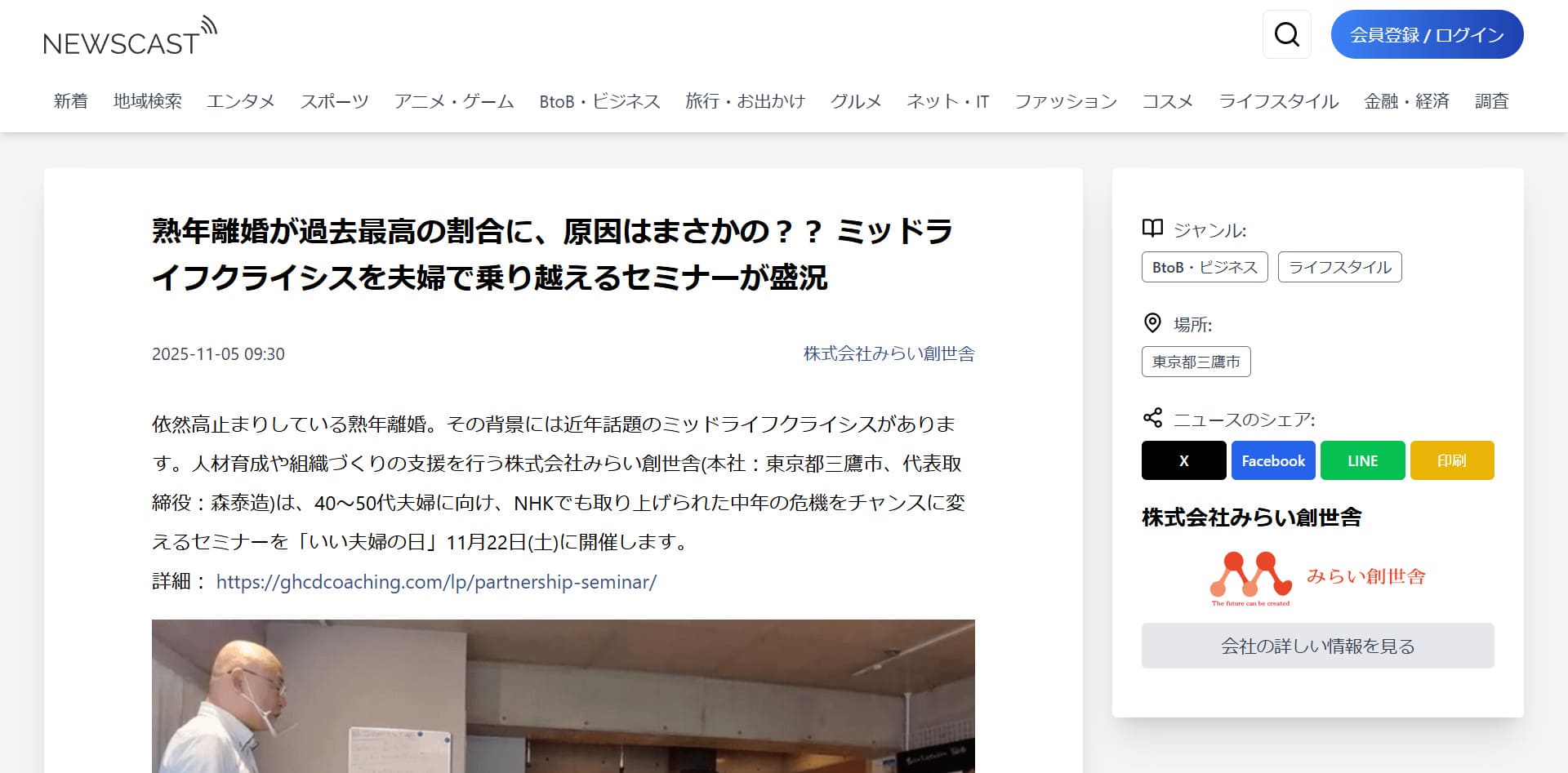 NEWSCAST「熟年離婚が過去最高の割合に、原因はまさかの??ミッドライフクライシスを夫婦で乗り越えるセミナーが盛況」(2025年11月5日)