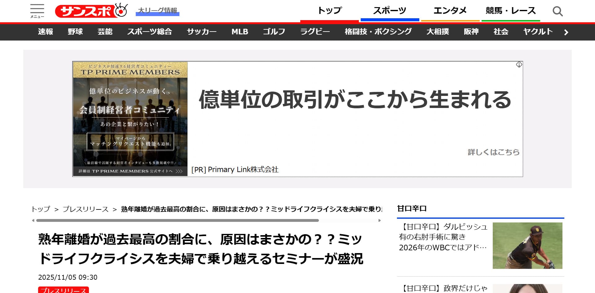サンスポ「熟年離婚が過去最高の割合に、原因はまさかの??ミッドライフクライシスを夫婦で乗り越えるセミナーが盛況」(2025年11月5日)