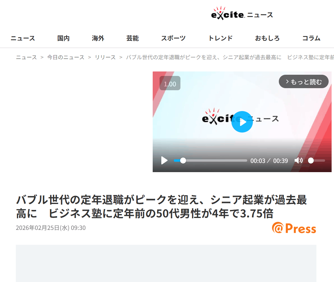 exciteニュース バブル世代の定年退職がピークを迎え、シニア起業が過去最高に ビジネス塾に定年前の50代男性が4年で3.75倍(2026月2月27日)
