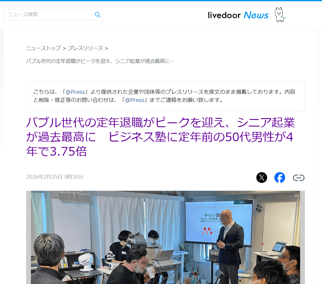 livedoor News バブル世代の定年退職がピークを迎え、シニア起業が過去最高に ビジネス塾に定年前の50代男性が4年で3.75倍(2026月2月27日)