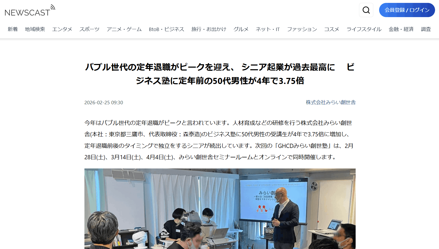 NEWSCAST バブル世代の定年退職がピークを迎え、シニア起業が過去最高に ビジネス塾に定年前の50代男性が4年で3.75倍(2026月2月27日)