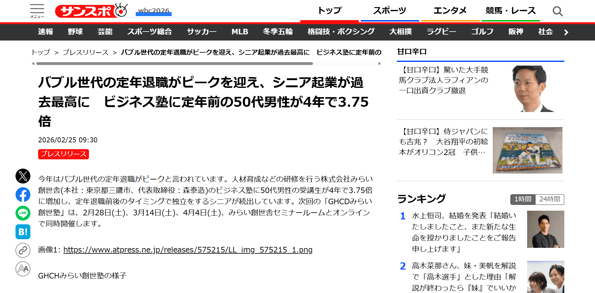 サンスポ バブル世代の定年退職がピークを迎え、シニア起業が過去最高に ビジネス塾に定年前の50代男性が4年で3.75倍(2026月2月27日)