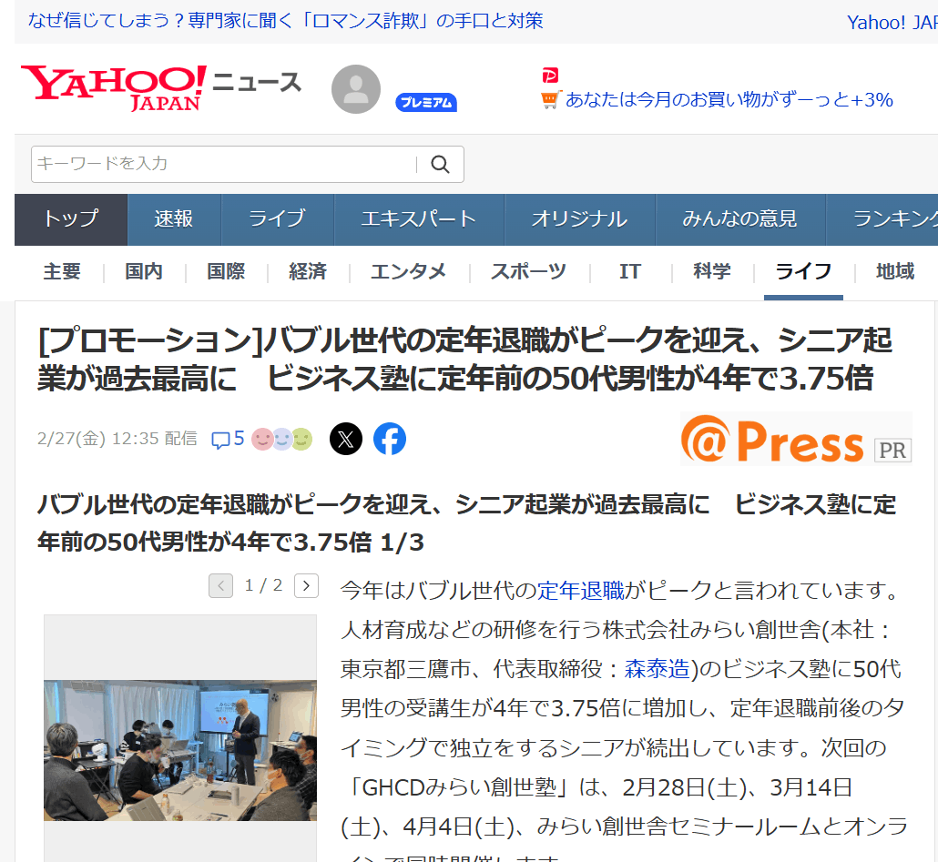 Yahoo!ニュース バブル世代の定年退職がピークを迎え、シニア起業が過去最高に ビジネス塾に定年前の50代男性が4年で3.75倍(2026月2月27日)